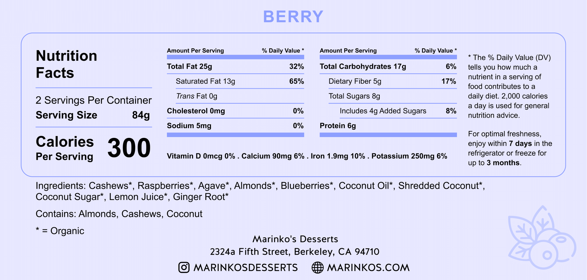 Cashews*, Raspberries*, Agave*, Almonds*, Blueberries*, Virgin Coconut Oil*, Shredded Coconut Unsweetened*, Coconut Sugar*, Lemon Juice*, Fresh Ginger Root*.