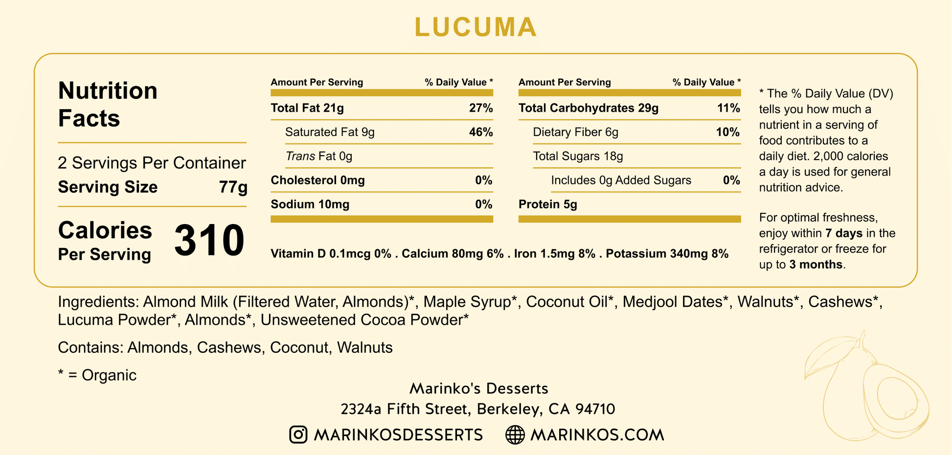 Almond Milk* (Filtered Water, Almonds), Maple Syrup*, Virgin Coconut Oil*, Medjool Dates*, Walnuts*, Cashews*, Lucuma Powder*, Almonds*, Unsweetened Cocoa Powder*.
