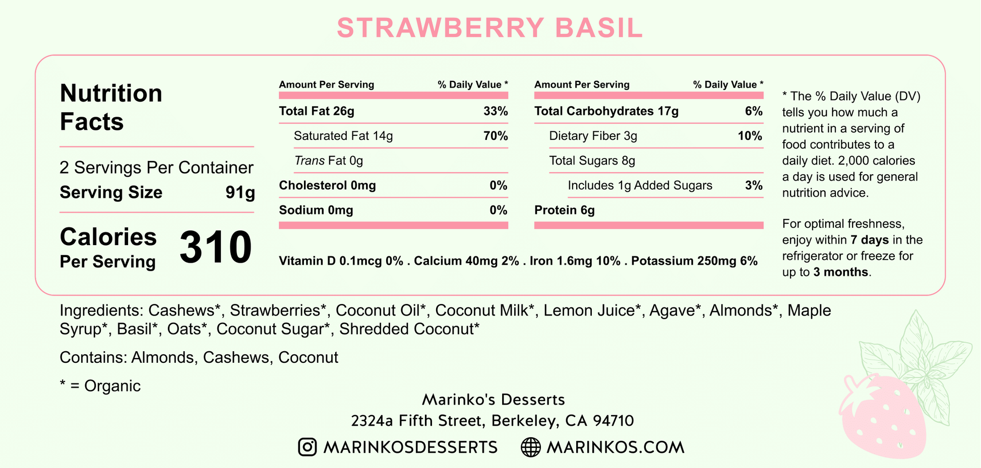 Cashews*, Strawberries*, Virgin Coconut Oil*, Coconut Milk*, Lemon Juice*, Agave*, Almonds*, Maple Syrup*, Basil*, Oats*, Coconut Sugar*, Shredded Coconut*.